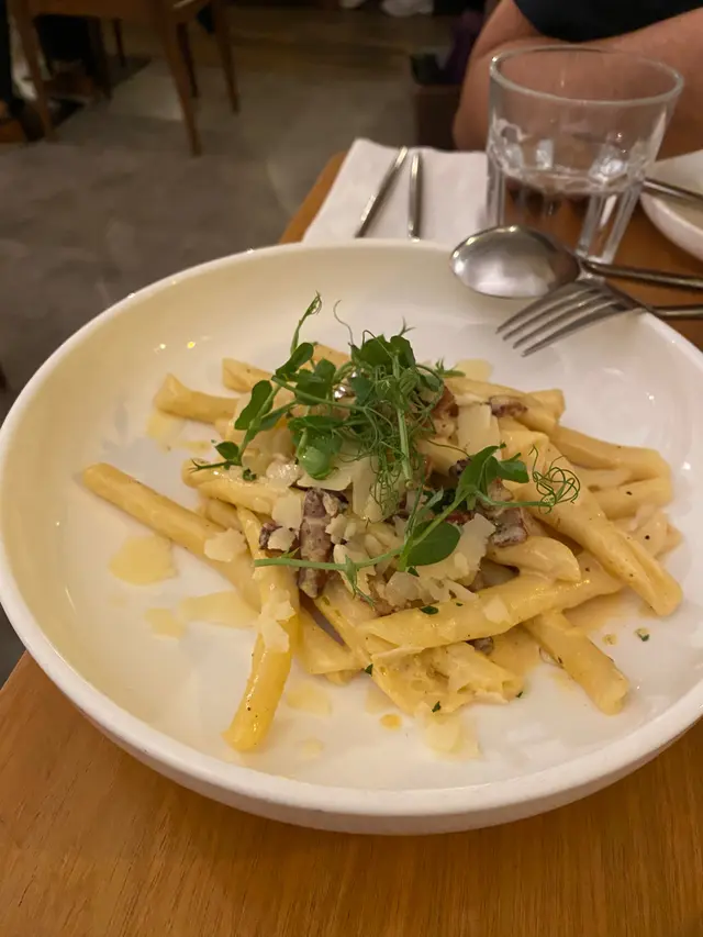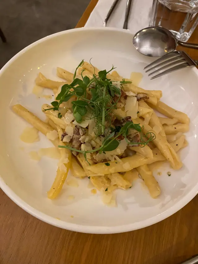 卡邦尼手捲意粉,第一次食呢種手捲意粉,有d似長通粉咁中間係充滿咗啲汁架~個汁稀杰到調得剛剛好,配埋厚切煙肉粒,味道濃郁好好食👍