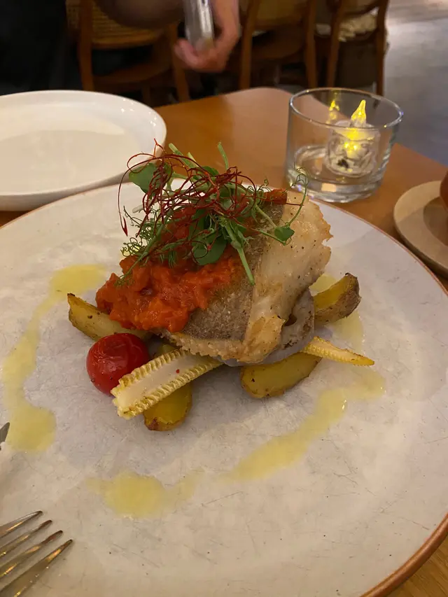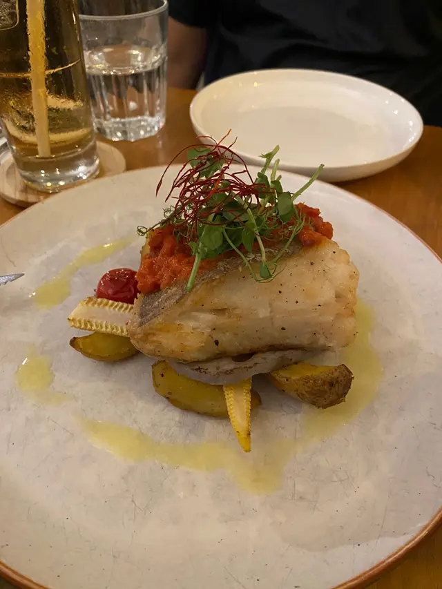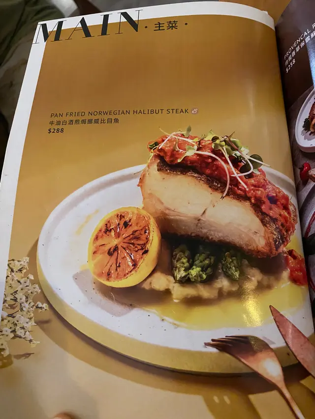 牛油白酒煎焗挪威比目魚,係好滑好滑嘅比目魚,自身嘅油脂好香,超好食!有少少蔬菜做配料,包括車厘茄、蓮藕、粟米芯、焗薯。