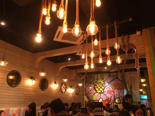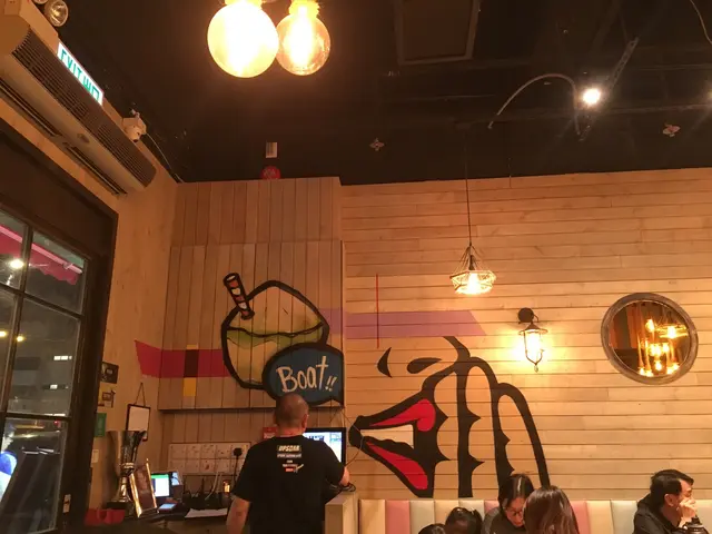 店內裝修就係一架大木船,牆身、門口全部都係木板舖砌。門口右邊有木造嘅船位,天花吊飾有纜繩、船燈等等。