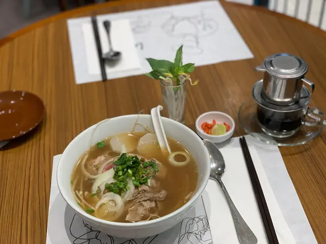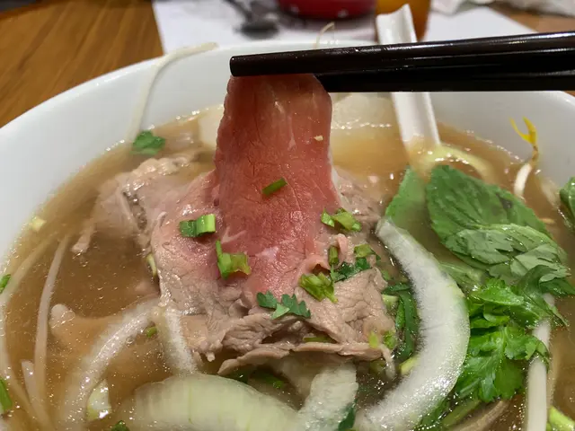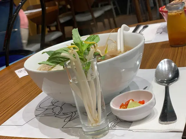 越式生牛肉湯粉 - 湯底清香,味道正宗。牛肉粉嫩,牛味香濃。芽菜用杯仔裝水種植著,又有青檸辣椒,好越式的風味。