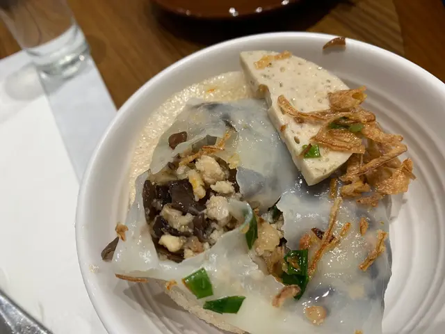 見到小食 札肉蒸粉包 未食過,就叫了一客share。入面有蝦米、豬肉碎、木耳等等,感覺有少少似中式點心/餃子。不過連同札肉、炸蝦片及沾上酸汁食,頓時變成東南亞風味!