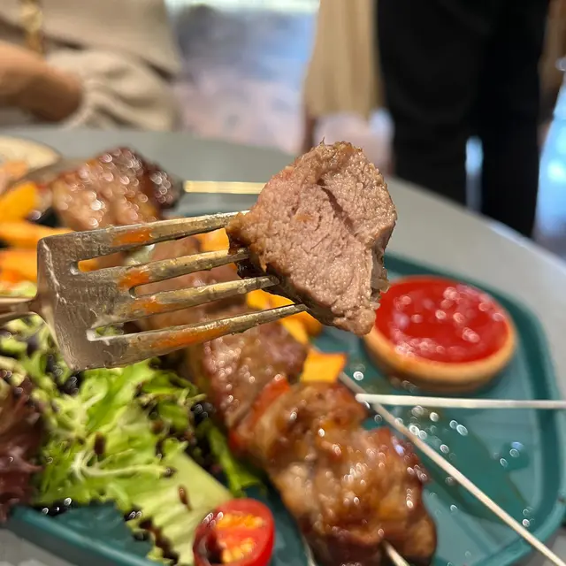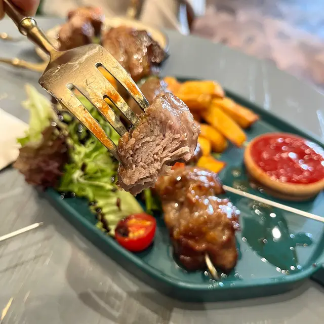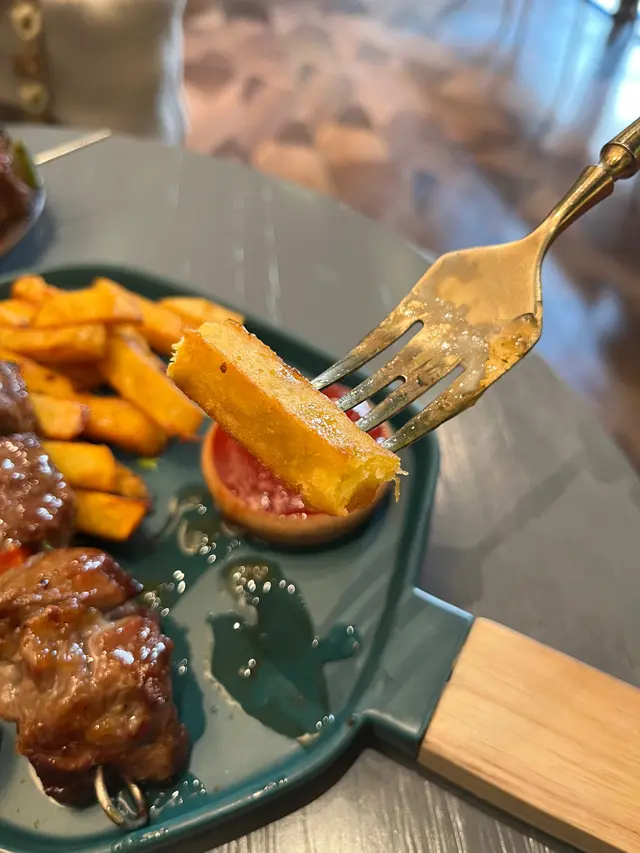 我地食左個 Main Dish —— 黑毛豬串燒。串燒嘅做法,簡直就好似美國人嘅outdoor barbecue style一樣,鐵針串起來、肉粒勁大粒厚切、中間攝入三色椒。外觀已經夠殺食,但冇諗到咁厚嘅肉粒,但裏面都係juicy, 可能就係因為出邊醃左冰梅醬,又或者慢煮過(掛?)所以好彩我哋本身冇嗌意粉或者飯,因為佢再加上炸甜番薯條、已經都幾飽肚~ 所以288的價錢都係有返相對型嘅質素