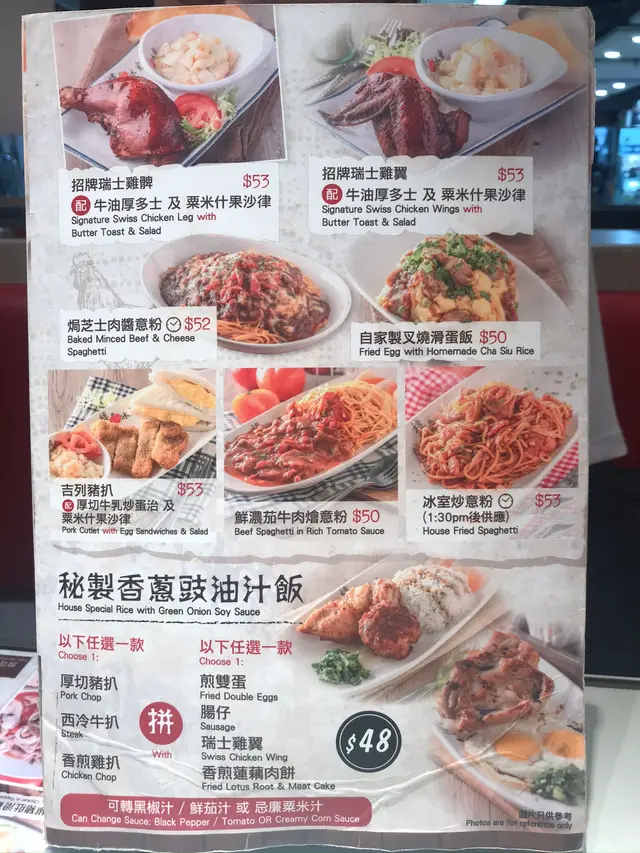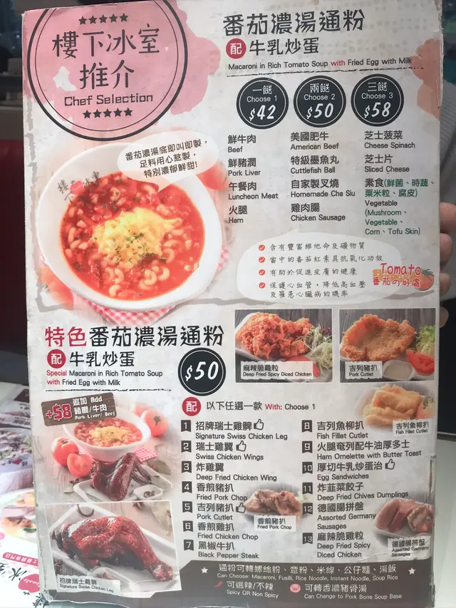 主打番茄濃湯通粉,有多種不同的配撘。另外單點選擇頗多,飯類、小食應有盡有。