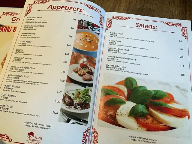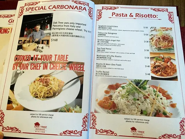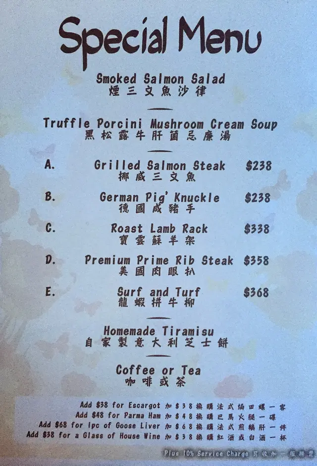 揭開大紅色的餐牌,除咗主力推介5道和7道菜的晚餐,更推出鵝肝套餐。至於散叫餐牌,分有前菜、沙律、薄餅、意粉、意大利飯、烤肉、海鮮、甜品等。