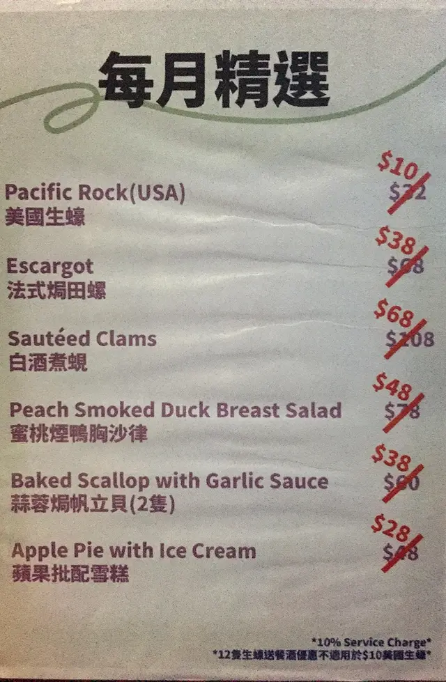 餐廳每個月都有精選推介,個人認為至抵食的$10一隻Pacific Rock生蠔,另外的法式田螺、白酒煮蜆、蜜桃煙鴨胸沙律、蒜蓉焗帆立貝和蘋果批配雪糕都有優惠。
