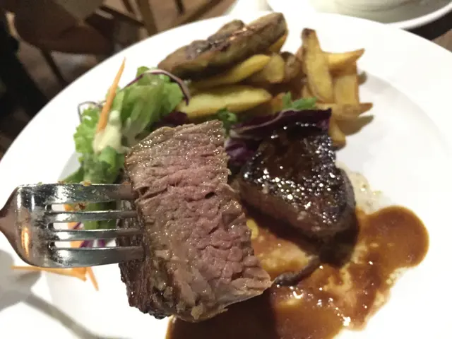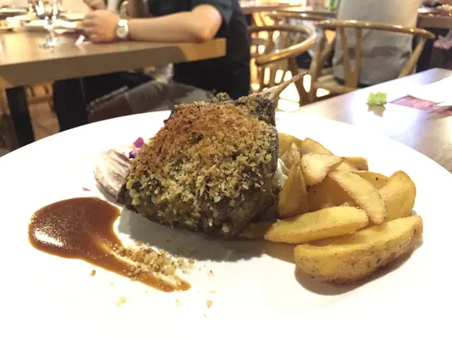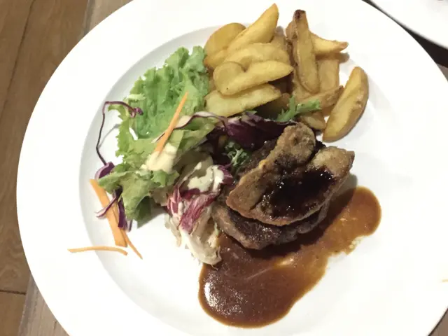 至於伴碟的薯角,炸得均匀而金黃,入口暖笠笠,外層乾身微脆且內裡充斥綿密香口的薯蓉泥,齋食薯條醮點茄汁拌著吃都教人滋味飽肚。不過鵝肝拼牛柳這一款菜式始終給人一種飽膩的感覺,只有雜菜沙律去調劑味蕾的平衡,似乎不太有成效,建議可加多兩片菠蘿等微酸的生果。