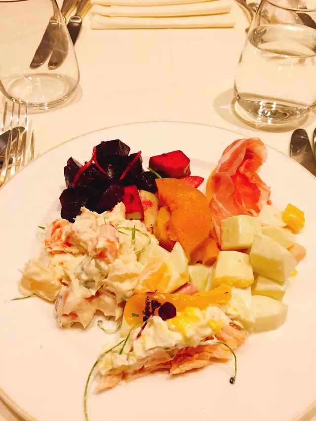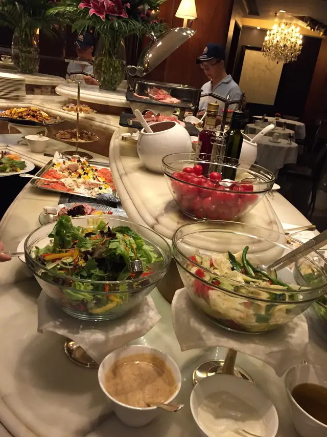 頭盤係沙律自助吧,有各式蔬菜沙律,青蘋果沙律...等等,最特別就係仲有原條嘅三文魚沙律。還有鴨胸、煙三文魚片、哈蜜瓜、火腿片、紅菜頭,車厘茄...材料新鮮。麵包係有侍應不定時奉上任揀任食,麵包種類繁多,唯獨是欠奉餐湯。