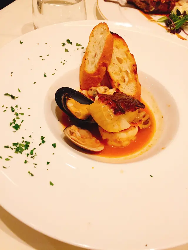 主菜可謂高級餐廳的姿態,碟頭不會太大但精緻吸睛!,比目魚只有一小塊,外皮煎得都幾香脆,但可惜肉質鞋口而無味,有D失望,好彩有啲龍蝦湯底可以點下,否則比白烚更無味!海鮮只有一隻蝦、一隻蜆仔、一小塊尤魚片和一隻青口,就係咁多,可能要D客人食過返尋味!好彩有沙律自助吧,否則晚上恐怕都要食公仔麵!