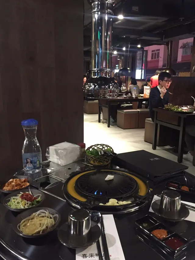 最後的烤肉,就是跟其店名命名的喜來烤肉!牛肉切成薄薄的一片片,然後堆砌成一朵美美的花,深得女士青睞!拍好照後就要辣手摧花!牛切得很薄,輕輕的在爐上一烤,油脂已經被迫出來,只要兩邊都輕烤一下就可吃了。質地非常嫩滑,脂肪比例高,油脂很香,美味!