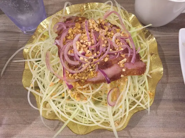 青木瓜多到唔駛錢咁,配洋蔥同花生碎,可以用撈檬汁拌住一齊食,清新開胃。豬頸肉比較厚身大大塊,邊位燒得甘香,口感略嫌韌左少少。