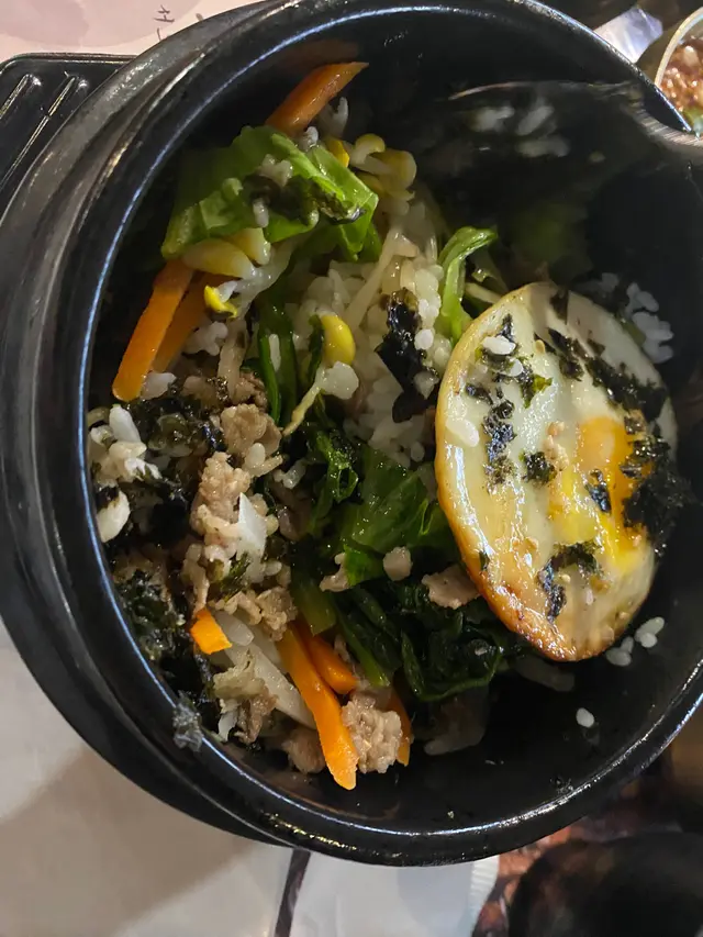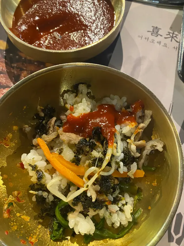 燒牛肉飯熱辣辣香噴噴,即叫即整;錯了有好多蔬菜,包括芽菜、紅蘿蔔絲、雞蛋、紫菜仲有好多牛肉,更有脆卜卜飯焦,撈勻韓式辣醬,好正