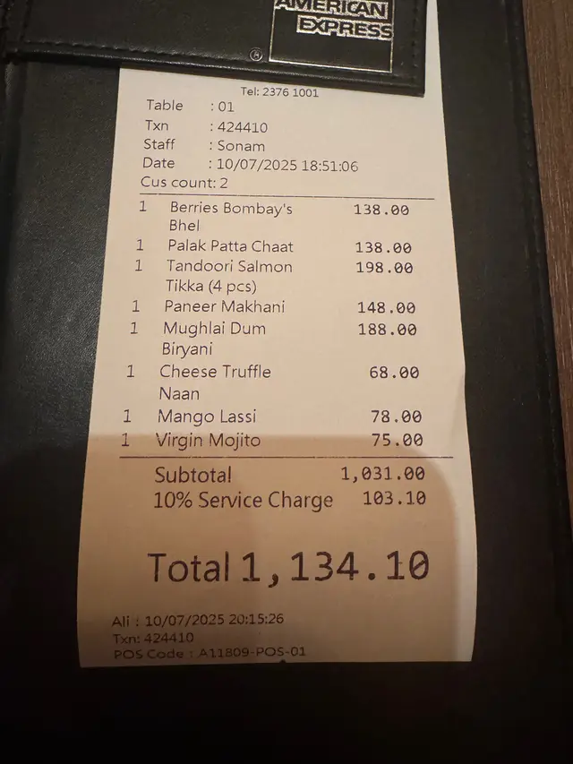 整體嚟講,菜式味道正宗又帶創意,份量適中,適合同朋友一齊share。服務員態度友好,見我哋有啲唔明白菜式嘅做法,佢仲主動解釋咗一啲印度菜嘅烹調方法,感覺好貼心。食物上菜時間都快,環境又舒服,尤其係live music,食飯時聽住印度傳統樂器同歌聲,感覺好似去佐一轉旅行,實在係意料之外嘅驚喜。坐喺度食飯真係好享受。