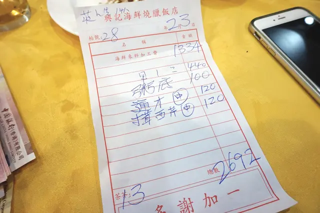 成晚食咗14道菜,大家飽到上心口。除油料費,茶位、醬料每位收$10,星期六、日、公眾假期嘅晚市要收加一,計埋燒鵝、炒菜、汽水及切餅費,晌興記埋單盛惠$2,692(註:佢張單都寫得好求其,有堆細數佢無列出嚟,我哋又無記低飲咗幾多罐汽水,都喺大概覺得合理就算),計埋發記買海鮮料使咗$5,180,是晚消費用咗$7,872,平均每人六百多啲啲。因為龍蝦兩食都做得麻麻,如果無要隻龍蝦,大家可以慳番百幾蚊,每人落樓唔使五嚿水!