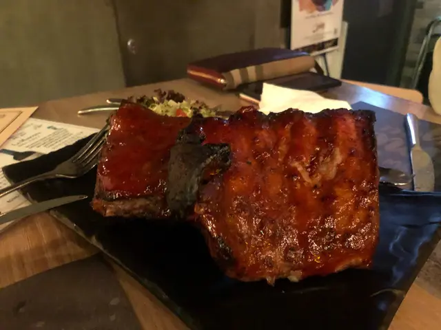 主菜方面我哋叫咗三款,包括墨汁海鮮意大利飯、BBQ醬配燒豬肋骨同埋法式燒羊架配薄荷。