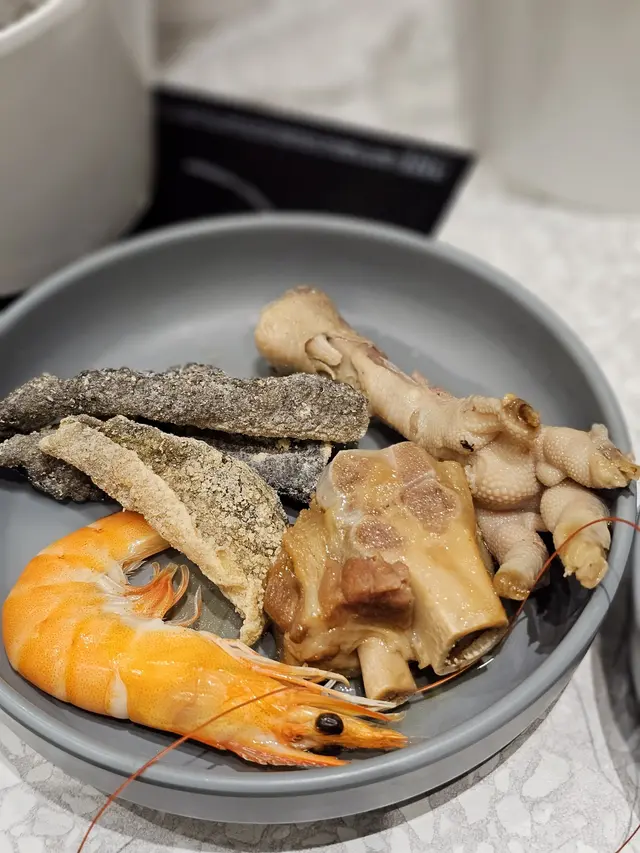 先選湯底再掃熟食, 十多款湯底; 有辣有唔辣, 有清有濃, 好多湯底都食過, 今次揀咗未試過嘅藥膳湯底, 清骨湯內加了紅棗、京蔥、當歸、桂圓、杞子.......等等, 藥材味唔算太強勁。