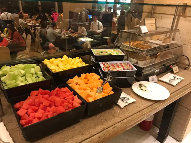 有 哈蜜瓜, 菠蘿, 西瓜, 蜜瓜, 旁邊有朱古力噴泉