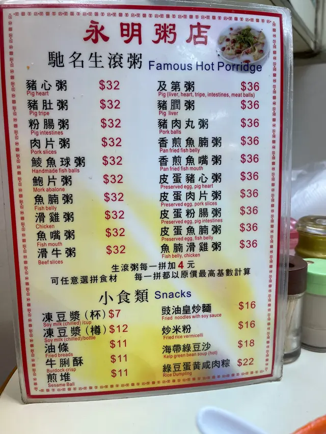 永明粥店,兒時的生滾粥風味 Dessert loversLevel 42025-06-13122 views Follow 很喜歡吃生滾粥,喜歡它夠熱,喜歡它食材新鮮。兒時物質缺乏,從明火白粥、油炸鬼,然後到生滾粥,就是喜歡。以前一直幫襯旺角的富記粥品,可惜老闆移民結業了。最近常去黃埔買花,順便吃亞玉豆腐花。有一天吃完豆腐花,很想吃粥,就問亞玉店員,附近有沒有好吃的粥店?她就介紹了永明,抱著試一試無妨的心態,環境很街坊式,冷氣都夠,店員有禮貌,點了煎魚嘴牛肉粥,生滾粥當然即叫即啦!端上桌,熱呼呼,滿滿的,真材實料,份量足,才$40。雖然天氣炎熱,慢慢吃,吃得很滿足。八卦問一下,哈哈!老闆說是 2009年開業的。下次再來,謝謝!1The above review is the personal opinion of a user which does not represent OpenRice's point of view.LikeShare永明粥店,兒時的生滾粥風味 永明粥店 https://s.openrice.com/QrKT0SSTS00Report Post Ratings5Taste3Decor4Service4Hygiene5ValueDate of Visit2025-06-06Dining MethodDine InType of MealLunch