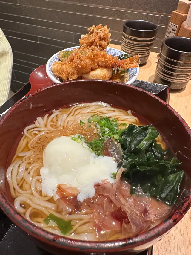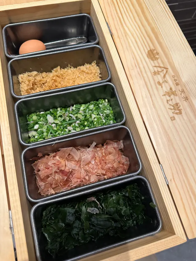 店員送上各款配料嘅盒子,裡面有溫泉蛋、蔥、木魚、海苔等。可以自行為烏冬添上配料。稻庭烏冬湯頭清甜,麵條粗而扁,入口細滑,頗有彈性。另外,迷你天丼份量也不少!有海老、菇菌、南瓜、豌豆、溫泉蛋。