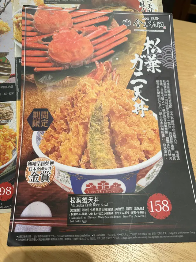 松葉蟹天丼$158期間限定,選用時令當造松葉蟹腳,連續七屆榮獲日本全國天丼金獎,當然要試一試!金子半之助使用傳統做法,重現江戶時代風味,新鮮炸起嘅天婦羅都適量均勻地沾上古早秘傳天丼醬汁。雖然唔似一般天婦羅咁脆口,但味道一定比坊間嘅天婦羅更美味!