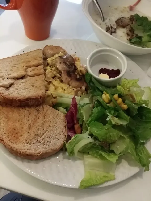 煙肉磨菇洋蔥炒蛋, 配裸麥多士, $47, 蘑菇和煙肉是混了蛋一起炒, 各人喜愛不同, 我比較喜歡分開炒, 因為炒埋一起時, 煙肉通常會唔夠燶脆, 磨菇又唔夠香口, 蛋更一定會過熟, 所以分開炒會好味好多.
