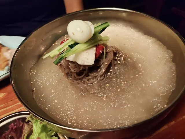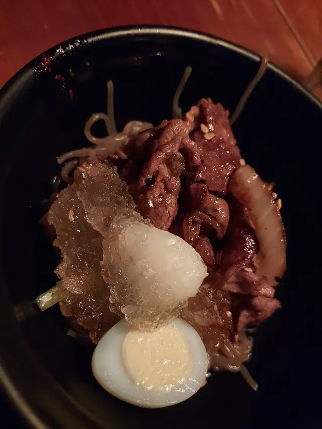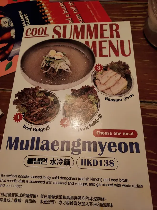 用蕎麥製成嘅蕎麥麵,麵質煙韌, 已白蘿蔔,泡菜, 高湯與蕎麥麵條一齊食。 還有蘿蔔,青瓜絲及一隻鵪鶉蛋。湯底有刨冰的,刨冰看似粉絲。