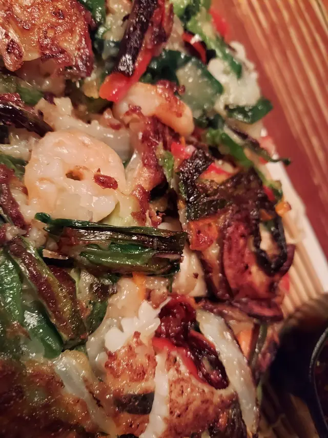 海鮮包括有蝦,魷魚,蔥。味道比較淡。必須要加上附上的醬汁一齊食。