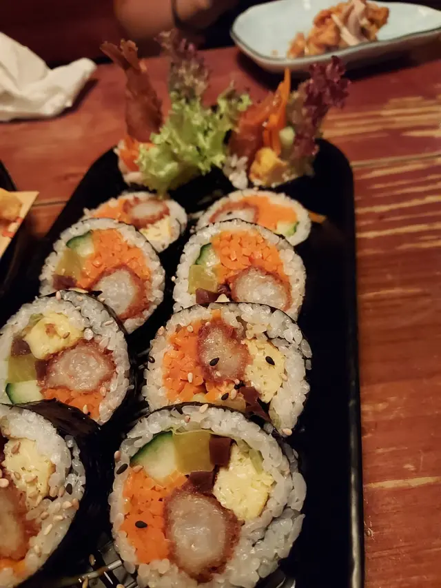 有8件飯卷,飯卷用上紅蘿蔔絲,炸蝦,蛋,蘿蔔粒用紫菜卷成的。味道口感豊富。