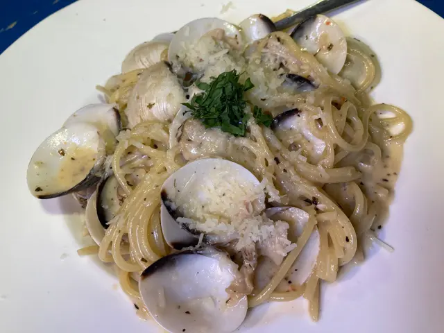 意粉伴有蒜蓉+蜆肉,醬汁由牛油+白酒製成