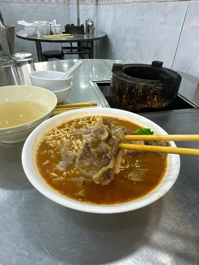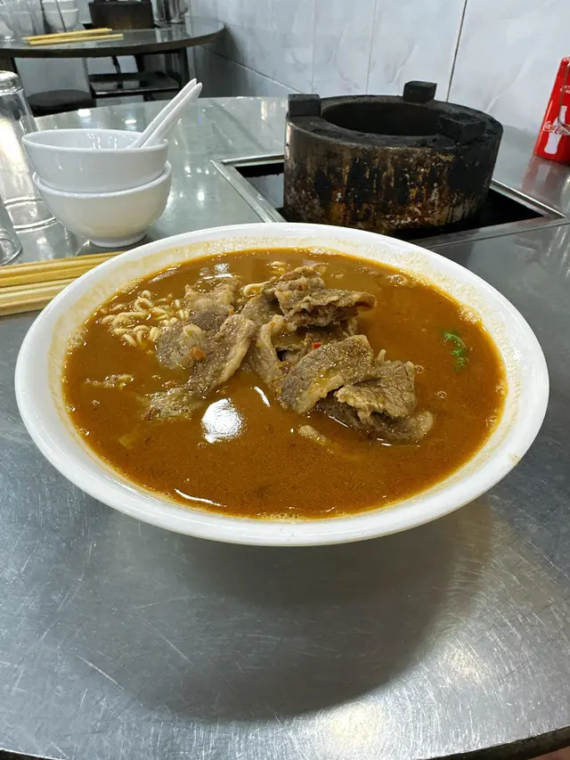 間唔中諗起食沙爹牛肉麵就會諗起方榮記,每次嚟都無失拖,今次下午三點幾嚟食個沙爹牛麵,入內見客人唔多,自己揀咗張近牆嘅枱坐,叫咗個麵但冇叫嘢飲,點的麵在三、四分鐘內就送到,顏色吸引,仲好細心跟多碗清湯添。 隨即起筷,雖然牛肉好似唔係塊塊都同一部位,但都好食嘅。 到差不多食完,突然有位小強到訪,在枱上遊走,我本身唔怕小強,只怕唔衞生,唯有湯都未飲晒就走人。 櫃檯話只收現金,盛惠七十蚊。 我下次都會再嚟嘅,佢始終係九龍城特色店,但希望下次小強唔好再嚟打招呼!