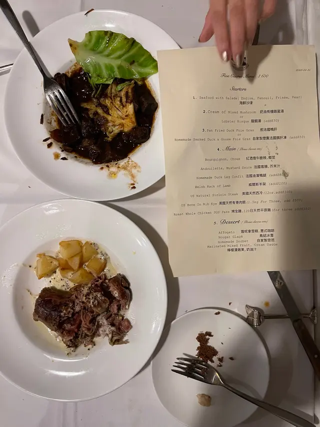 被店名吸引预约的2月25日晚上七点去吃这家餐厅。水的口感是自来水经过滤。灯光灰暗,装饰古仆,桌子轻盈,双手不小心碰到有可能翻桌。头菜,甘中带苦涩。龙虾汤直接难以入口味重,只能借助面包一起入口。法国套肠,臭的难以入咽,只能放弃品尝。服务员吃了一口去厨房吐了,味道与菜市场未处理的大肠一样(附照片图二)厨师是一位老人家不带口罩不带帽子。牛脸颊肉,入口似如干柴,显粉状,明显不新鲜。两道甜点与街边小贩相差甚远。