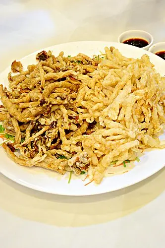 椒鹽茶樹菇及雞脾菇,兩款菇都炸得香脆可口,菇肉沒有乾身情況,也有點菌汁,加上椒鹽味,就比較惹味。黃金甲鍋粑,脆鍋粑上伴芝士及素肉醬汁來吃,芝士味濃,也可試試。