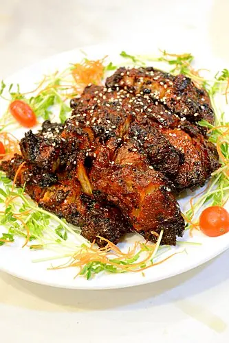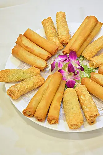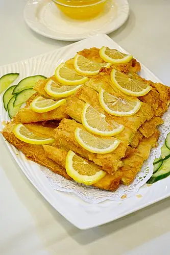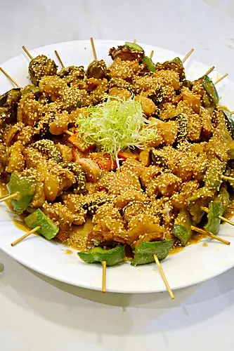 素春卷及腐皮卷,餡料減去豬肉,改以甘蔬菜粒來造,口感同樣豐富,香脆不太油膩。西檸素雞,以腐皮來造成素雞,炸後外層帶脆,咬著帶點扎實,蘸上西檸醬汁,酸酸甜甜,味道不錯。串燒什錦,有甘荀、青椒、菠蘿及素魚旦,雖燒得不夠焦香,但燒汁味道濃稠味帶甜。