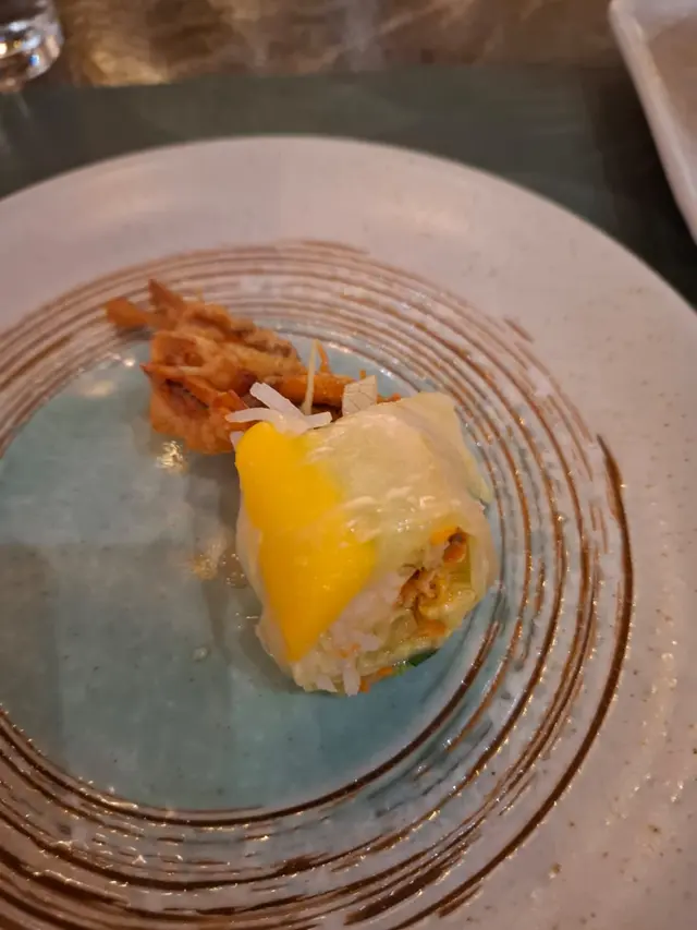 這道米紙卷,是視覺與味覺的雙重享受。晶瑩剔透的越南米紙,輕柔包裹著金黃酥脆的整隻軟殼蟹,佐以新鮮清甜的芒果條、爽脆青瓜絲、彈牙米粉,再點綴幾片提味的香草。軟殼蟹炸得恰到好處,外層酥香無比,內裡蟹肉鮮嫩帶汁,火候掌控盡顯功力。當季芒果的豐盈果甜,完美中和了油炸的微膩,與青瓜的爽脆、香草的獨特氣息交織,譜出層次豐富的夏日協奏曲。蘸上店家特調的甜辣醬或魚露汁,更添一抹開胃的東南亞風情,每一口都充滿驚喜,清新與香脆的平衡令人回味無窮。