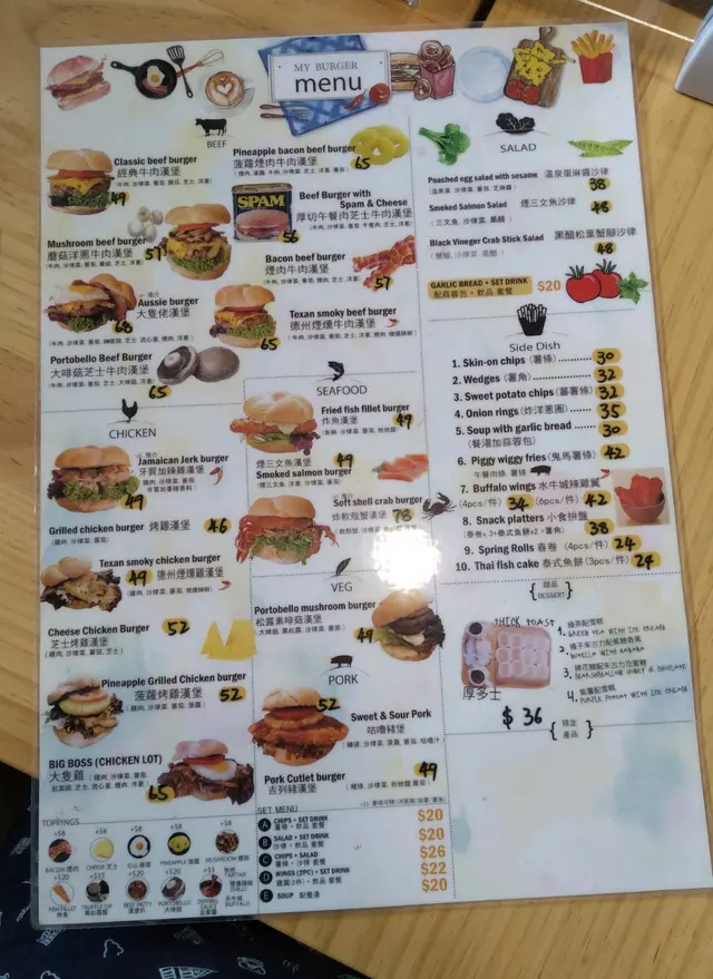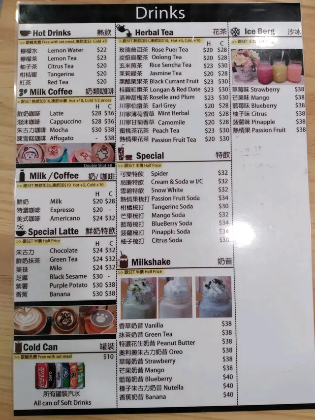 門面張貼了特大餐牌,臚列着各項餐飲的中/西名目、菜色、價錢,一覽無遺,加之,頂端飾以可愛的水彩插畫作點綴,既有功能性,又漂亮吸睛,留住了路人的腳步。