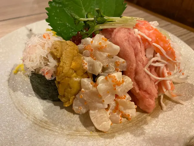如果menu上唔講係壽司既話,就咁真係睇唔出係壽司,蟹肉蟹柳、海膽、吞拿魚蓉、沙律魷魚粒同三文魚籽,樣樣都多到滿瀉曬,直頭可以形容為淹沒咗啲壽司飯,加埋蛋絲既配搭,簡直一絕!
