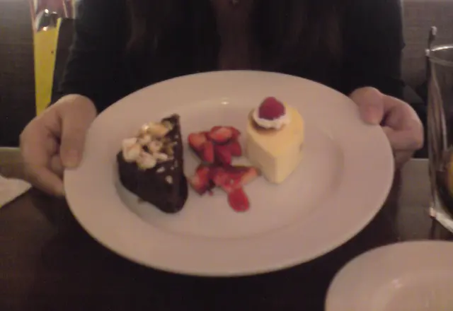 首先黎既係house wine,個人黎講本身對紅酒冇咩研究但係入口感覺都算ok唔會太酸太澀起碼好過酒樓果d。之後一次過黎晒什錦拼盤同埋兩碟主菜,忽然間張枱好充實。什錦拼盤有炸魷圈、蒜香雞翼、沙律醬炸青椒同蒜蓉包,唔算好特別。主菜方面pizza亦只係波蘿火腿,簡單得黎味道都ok,但我估唔到"sweet heart pizza"原來真係整左個心形薄餅出黎幾有心思喎,算得上係睇得又食得既菜式。另一個主菜係大蝦露筍磨菇汁意粉,我覺得清淡少少但我女友就話好味。最後dessert 係石板街朱古力蛋糕同果仁cheese cake,反而成餐飯我最鍾意係呢兩樣。