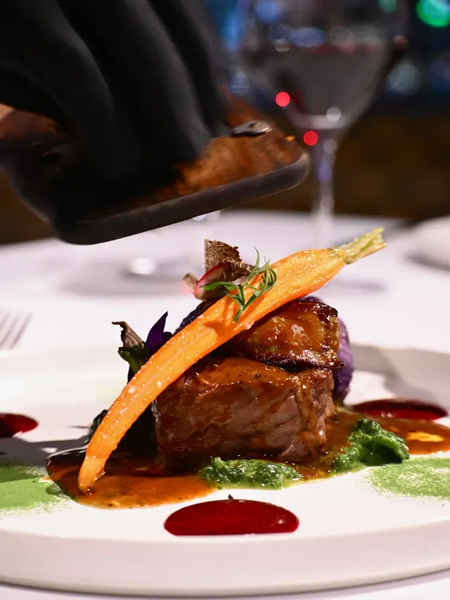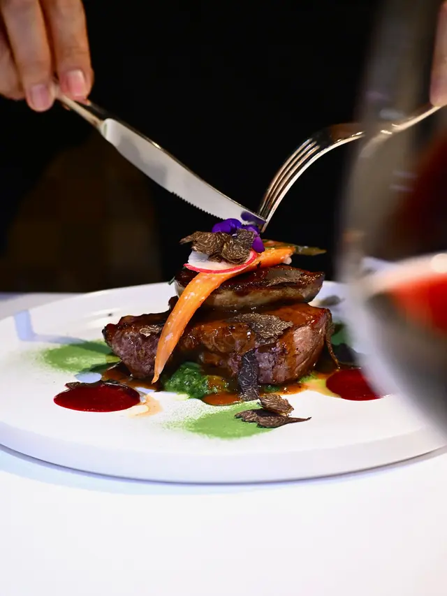 🥩 烤西冷牛扒、香煎鴨肝、車厘子蓉、黑松露汁