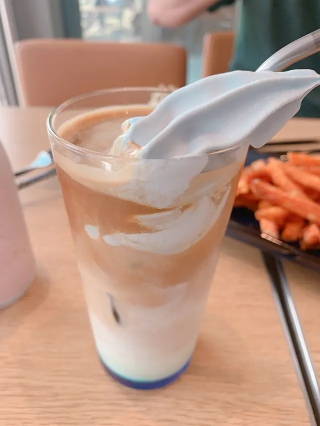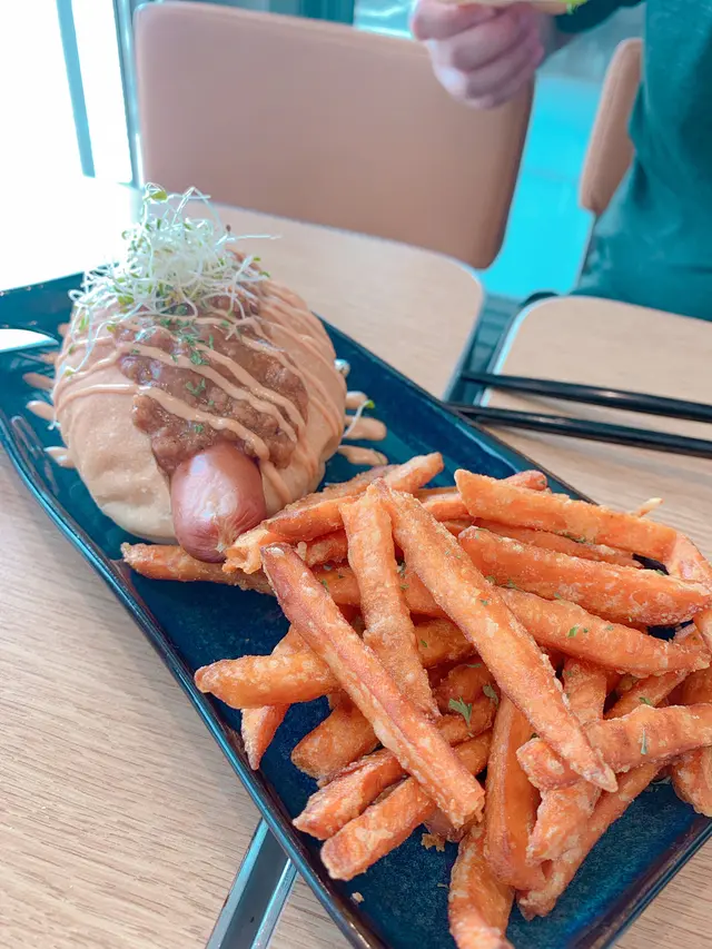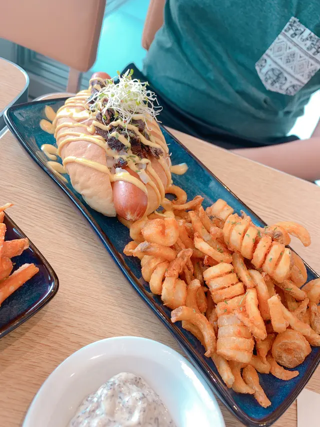 而男友就叫左個blue eyes latte , 上面係一層藍色雪糕。角色嘅飲品同埋熱狗之外,呢度仲有比較特色嘅薯條,我哋分別叫咗一個薯圈,仲有一個甜薯條。薯條嘅味道好特別,除咗有咬口之外,仲可以唔使點任何醬汁,都非常之好味。搬上叫咗呢度少少嘢食,我哋已經非常之飽,其實仲有好多其他嘢食我哋仲未試,下次一定會再嚟試埋其他唔同味道嘅熱狗。