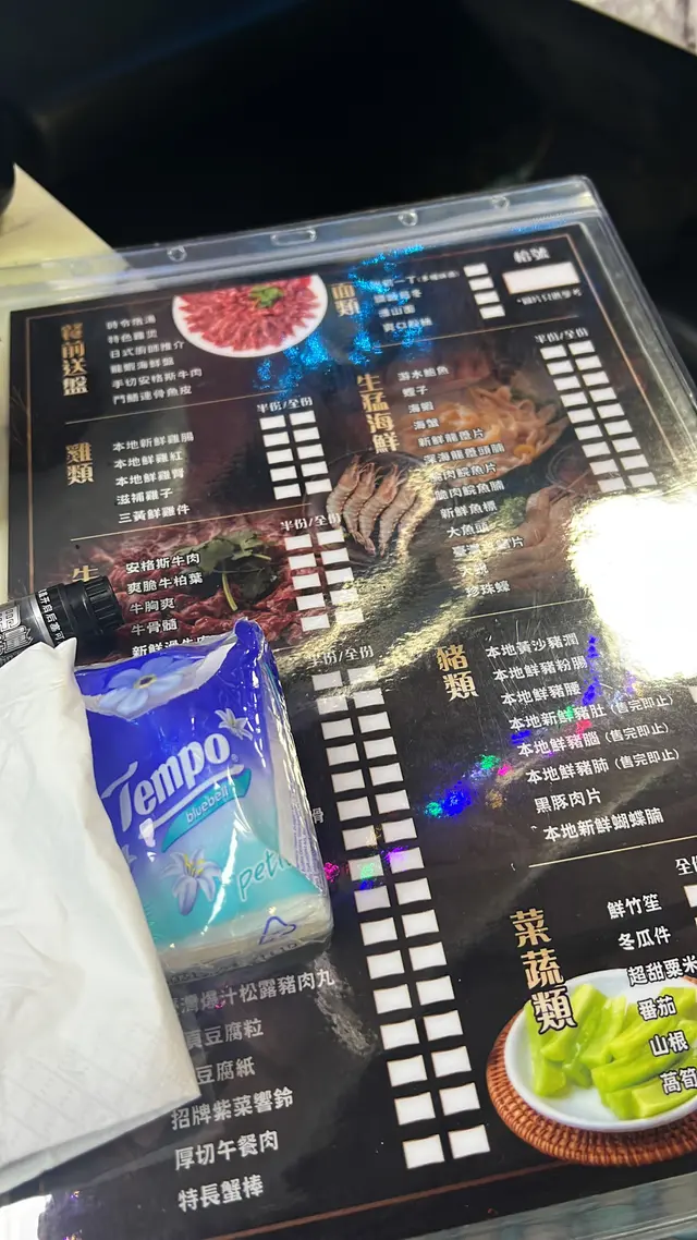 開始打邊爐先上咗一份海鮮拼盤有蟹、龍蝦、帶子、鮑魚、蝦,另外送一份安格斯牛肉,送嘅海鮮拼盤入面既鮑魚同帶子係正常,但蟹、龍蝦同蝦啲肉都係霉既完全唔新鮮。食完送嘅海鮮有個餐牌係用白枝筆寫俾你落單用,寫完叫職員嚟落單先話每次落單只可以點九樣嘢,但入座時介紹又唔講埋😅?