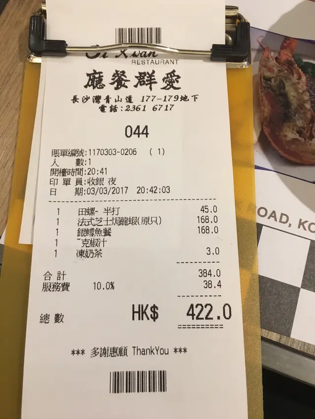 海鮮式鋸扒 MMeatLevel 32017-03-051K views Follow 非常邪惡嘅配搭,本來想搵西餐食,見到呢間都算西餐就入去試下。set入餐包係免費贈送的,而餐湯有紅湯同白湯選擇。湯入面餡料唔算多。酥皮焗田螺,配搭突出,味道還相當不錯。原隻法式芝士焗龍蝦,份量都算大,加上芝士味唔算好濃,所以食落唔覺得好漏!鐵板銀雪魚,餐有唔同既汁比你選擇,不過我覺得用黎點好過淋上去,成塊魚柳咁一d骨都冇,就咁食都好夠味!飲唔size都算大價錢都算實惠,而且有甜品送,有雪糕或啫哩比我選擇。The above review is the personal opinion of a user which does not represent OpenRice's point of view.LikeShare海鮮式鋸扒 愛群餐廳 https://s.openrice.com/QrKT04DKf00Report Post Ratings3Taste3Decor3Service3Hygiene3ValueDining MethodDine In