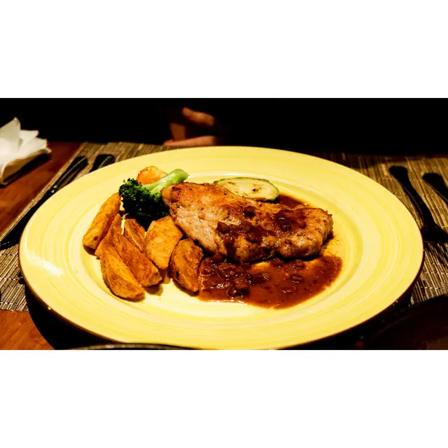 肉質偏厚實型,但比想像中爽嫩,也充滿嚼勁,豬肉味道夠濃,醬汁帶點酸甜,中和了豬油的膩。它的配菜一樣是烤薯,就沒有了餐排所說的玉米糕條。