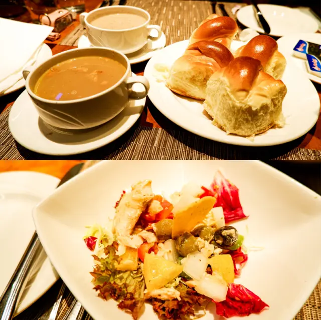 廚師精選沙律和每日餐湯當然也是天天不一樣,但特別想提一下沙律的用料很豐富,像這天又是螺絲粉、熟三文魚碎、橄欖、黃椒,就不是只有沙律菜這麼隨便的;至於中西餐湯和餐包就正常發揮,當中濃郁的蘑菇忌廉湯比較突出;最後每人會有一杯餐飲。