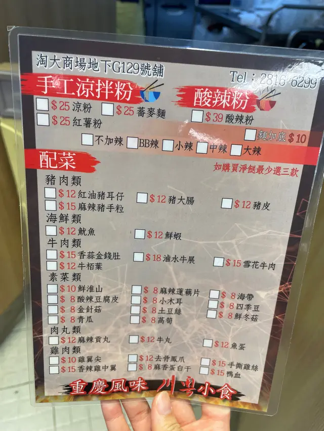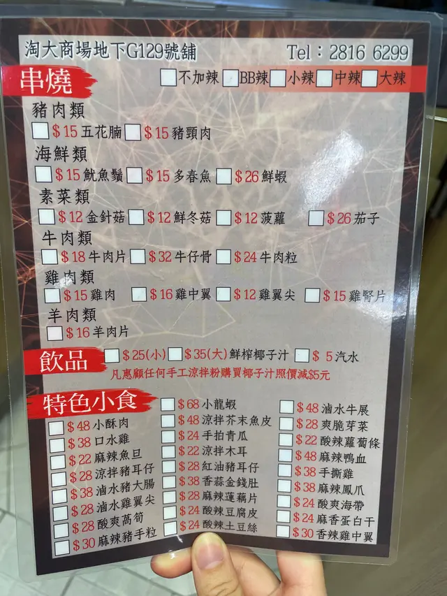 淘大抵食串燒!即叫即整 hkfoodieclubLevel 42022-06-2841 views Follow 串燒五花腩五花籃肥瘦均勻,有少少豬皮黐住,厚薄適中,而且仲好juicy 添!川燒雞翼雞翼嘅外皮乾身,香脆!配上秘製嘅調味粉好惹味🌟串燒魷魚鬚魷魚鬚燒得剛剛好,唔會過熟,食落有少少咬口。不過調味粉落得比較多,所以食落就比較辣😂😂酸辣粉酸辣粉係比較淡口味嗰種,我叫咗bb辣所以唔會好酸同好辣。大概係10小辣個種啦😂份量都幾足,配上雪花肥牛簡直係完美絕配😝神奇嘅係食完呢個酸辣粉唔會太口渴!川粵 (九龍灣)九龍灣牛頭角道77號淘大商場一期地下G129號舖The above review is the personal opinion of a user which does not represent OpenRice's point of view.LikeShare淘大抵食串燒!即叫即整 川粵 (淘大商場1期) https://s.openrice.com/QrKT0RBX300Report Post Ratings5Taste4Decor4Service4Hygiene5ValueDate of Visit2022-06-26Waiting Time10 Minutes (Dine In)Spending Per Head$60 (Dinner)