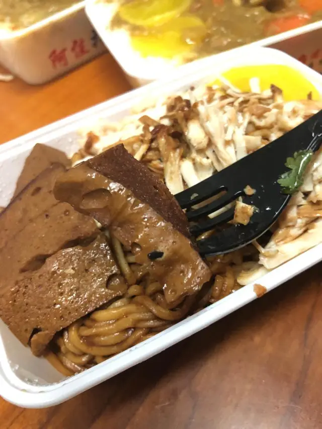 佢個麵係用醬油炒過, 好入味, 唔需要要額外加調味料; 鹽水雞應該係手撕雞, 都係撕開一條條咁。 可以加$5追加魚蛋或者千頁豆腐, 我見未試過千頁豆腐所以就試試佢! 個口感好似魚片咁好夾口好彈, 用醬油浸過睇落似豬紅咁, 但我覺得好好食, 未食過豆腐係呢個口感