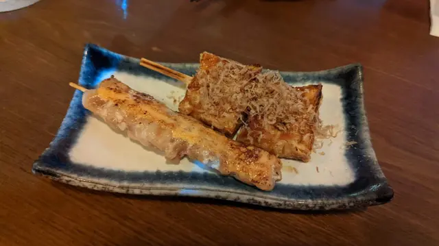 脆燒豆腐($32),以串燒方式上碟,感覺特別。豆腐炸得香脆醬汁味不濃,點到即止,不會蓋過原來的豆腐味道。雞腿肉加上明太子($38),燒得很夠火喉,雞肉彈牙,加上獨特的明太子醬,好想再吃多一串呀!