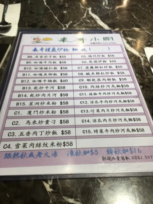港式表哥廈門炒米 Magic ShowLevel 42019-05-272K views Follow 炮台山地鐵站附近有很多港式茶餐廳,這間表哥小㕑開了一年左右吧,一直也未試過,今天叫了廈門炒米粉跟老火湯。 廈門炒米粉並非源於廈門,其實是香港式的炒米粉,不同食肆各有其炒法。表哥小廚在餐牌上寫「表哥鑊氣炒粉面飯」,炒米粉拿來時真的嗅到一陣炒鑊氣味,也有少少油煙味。 廈門炒米粉的酸甜味調校適中,用的是五柳菜,米粉爽口亦不太油膩,配料有蝦、蛋、叉燒、火腿、洋蔥、芽菜、韭菜。整體來說,這個炒米粉不過不失。 反而值得一提的是跟餐的老火湯,是日靚湯有冬瓜紅蘿蔔排骨杏仁薏米,味道不錯。The above review is the personal opinion of a user which does not represent OpenRice's point of view.LikeShare港式表哥廈門炒米 表哥小廚 https://s.openrice.com/QrKT0TIGq00Report Post Ratings3Taste3Decor3Service3Hygiene3ValueDining MethodDine InSpending Per Head$58