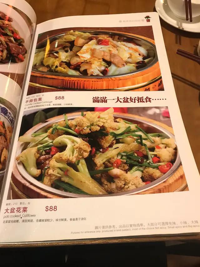 主菜有不同的川式、湘式菜品,有麻辣、水煮、乾鍋等,同時亦有不同的涼菜及主食可選擇。