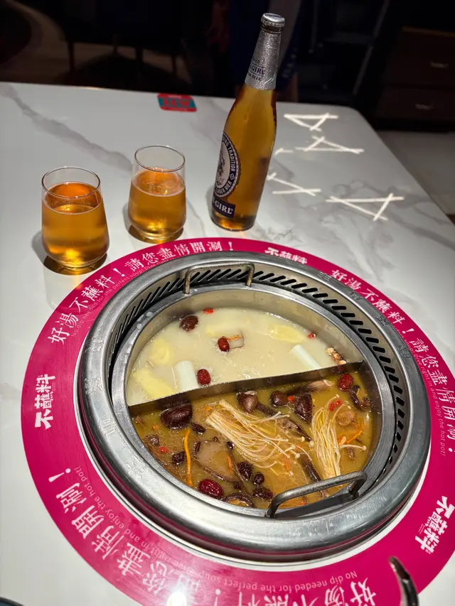 點左濃湯同菌湯鴛鴦湯底,湯底係即日新鮮熬製,配以當歸、黨參、白蔻、枸杞等天然草本調味,溫潤滋補而不燥,所以「不蘸料」就已經夠晒味,極為健康有營。