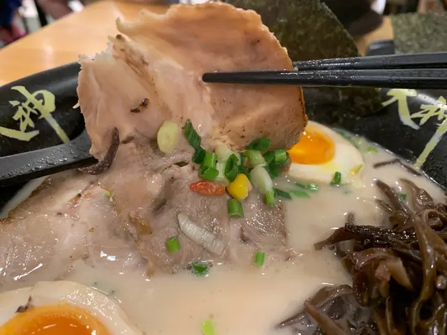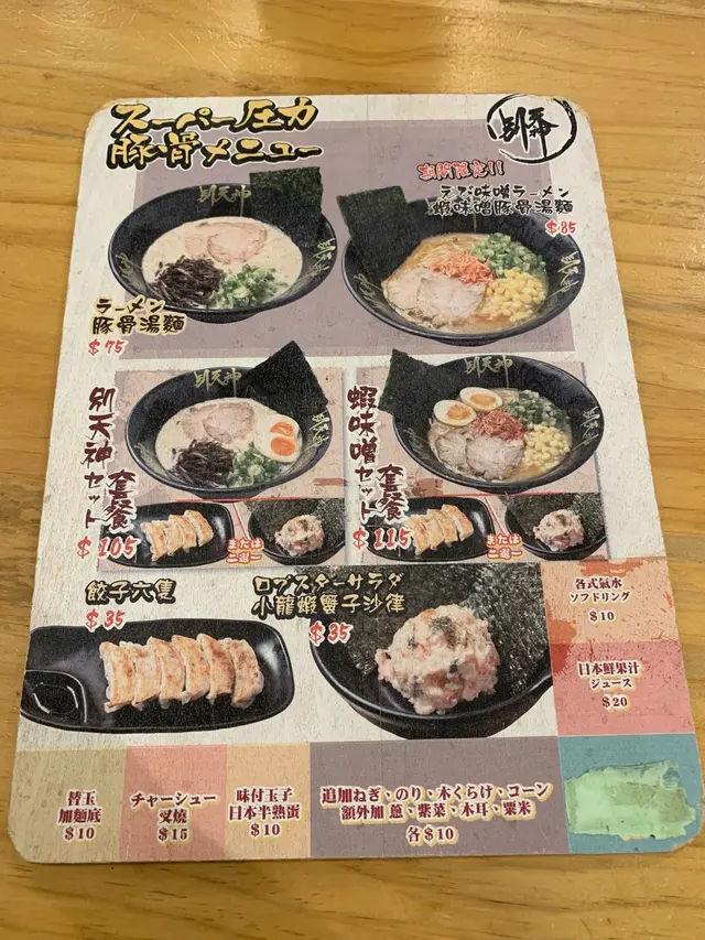 拉面方面,我哋有豚骨湯麵同蝦味噌豚骨拉麵兩款。豚骨湯麵湯底濃郁,未飲已聞到豚肉嘅鮮味,飲落雖然香濃但唔肥膩。別天神係黎自九州既拉麵店,所以麵嘅粗幼偏向幼麵,硬度適中。麵吸收咗湯底濃郁嘅香味,令人一吃再吃。豚肉選用半肥瘦,有油香之餘唔會太膩,香味十足。配料就有黑木耳, 蔥同紫菜,令成碗麵味道同口感進一步提升。至於蝦味噌豚骨湯麵湯底除咗豚肉味之外,蝦味都非常出眾,唔會比豚肉味掩蓋,好鮮味。配料就有粟米,蔥,柴菜同櫻花蝦乾,進一步帶出蝦味。