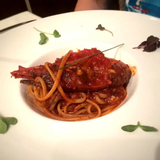 紅蝦蕃茄扁麵很多汁,和麵一起吃就像在「吃」龍蝦湯般,遇著這個好味東西林生都不顧什麼儀態了,一口咄著蝦頭要把汁都吸乾。